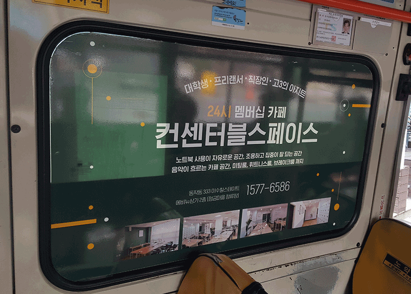 시내버스 내부광고 타 광고는 순간적으로 흐르는 광고임에 비해 항상 같은 구간을 지속적으로 반복 운행하는 버스광고는 고객들로 하여금 잠재의식중에 기업에 대한 마케팅 효과와 상품 구매욕을 강하게 이끌어 낼 수 있으며 밀폐된 일정 공간 내에서 타광고 매체와의 경쟁없이 목적지까지 이동시간 동안 고객으로 하여금 독점 게시에 의한 강한 광고 효과를 볼 수 있습니다.