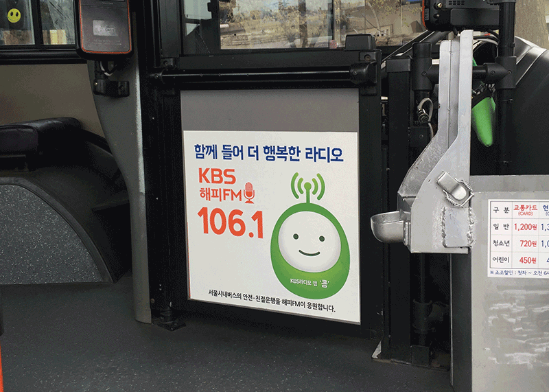 시내버스 내부광고 중 가장 큰 광고면으로서 버스를 타면 무조건 볼 수밖에 없는 위치에 있어 효과가 가장 뛰어나며 클라이언트에게 인기 있고, 선호도가 높은 광고매체입니다. 하차문 바로 옆에 위치해 있어 버스를 탄 모든 승객에게 강제 노출됩니다.