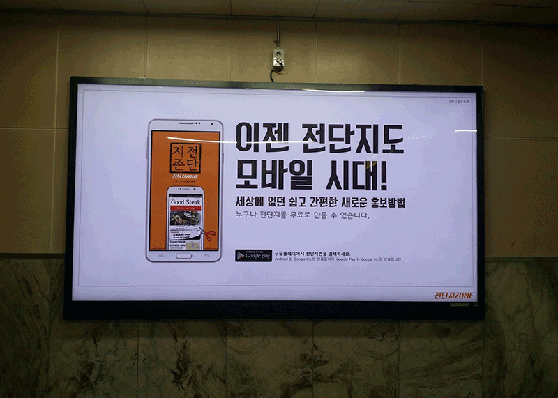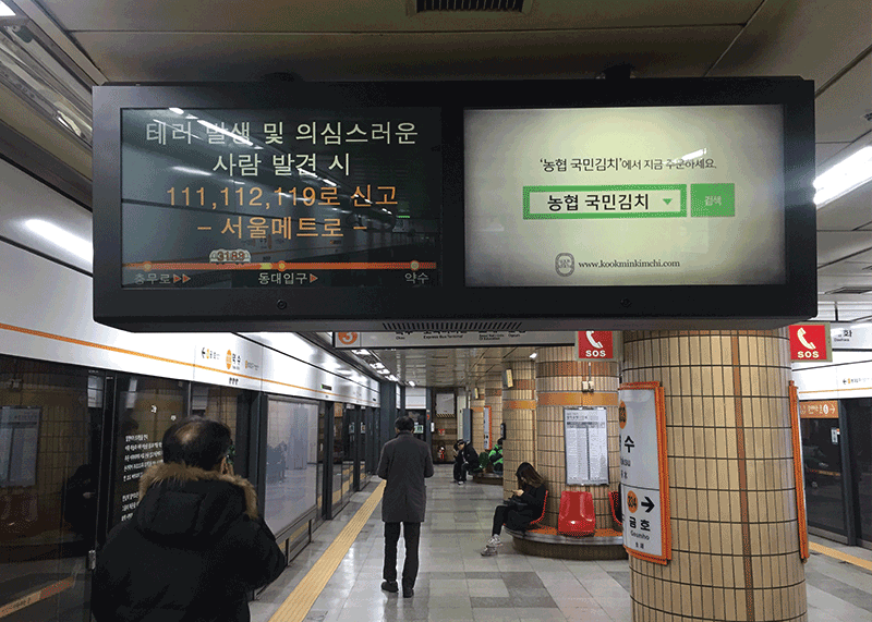 지하철 대합실 및 통로 상단에 다음 역과 종착지를 안내해 주는 행선안내시스템을 활용한 영상광고로 반복 노출되어 승객들의 승, 하차시 동선의 가시장애 없이 승객들에게 자사의 기업이미지나 제품 홍보를 영상매체를 통해 표출되는 매체입니다.