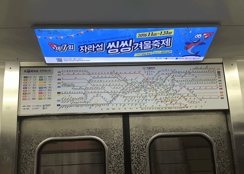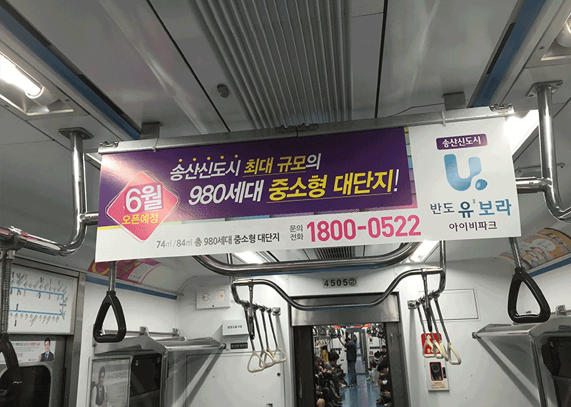 광고사이즈에 비해 광고료가 저렴하며, 매체가 상단에 위치해 있어 출/퇴근 시 차내 혼잡도와 관계없이 지속적인 광고 표출이 가능한 매체입니다.